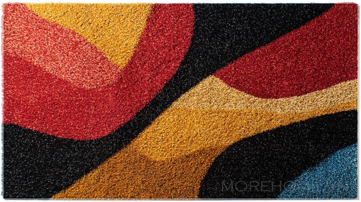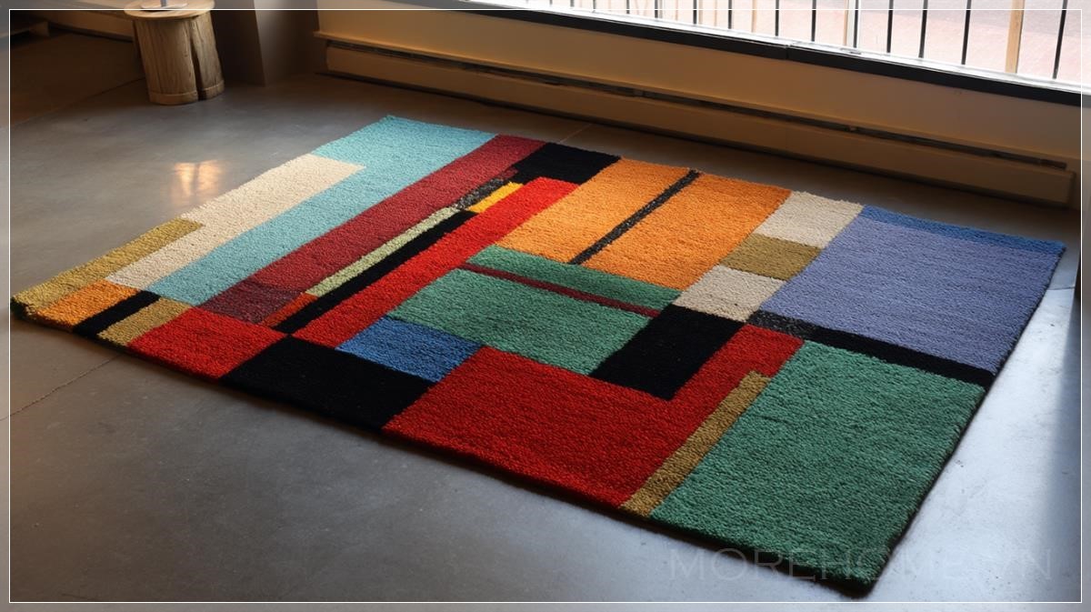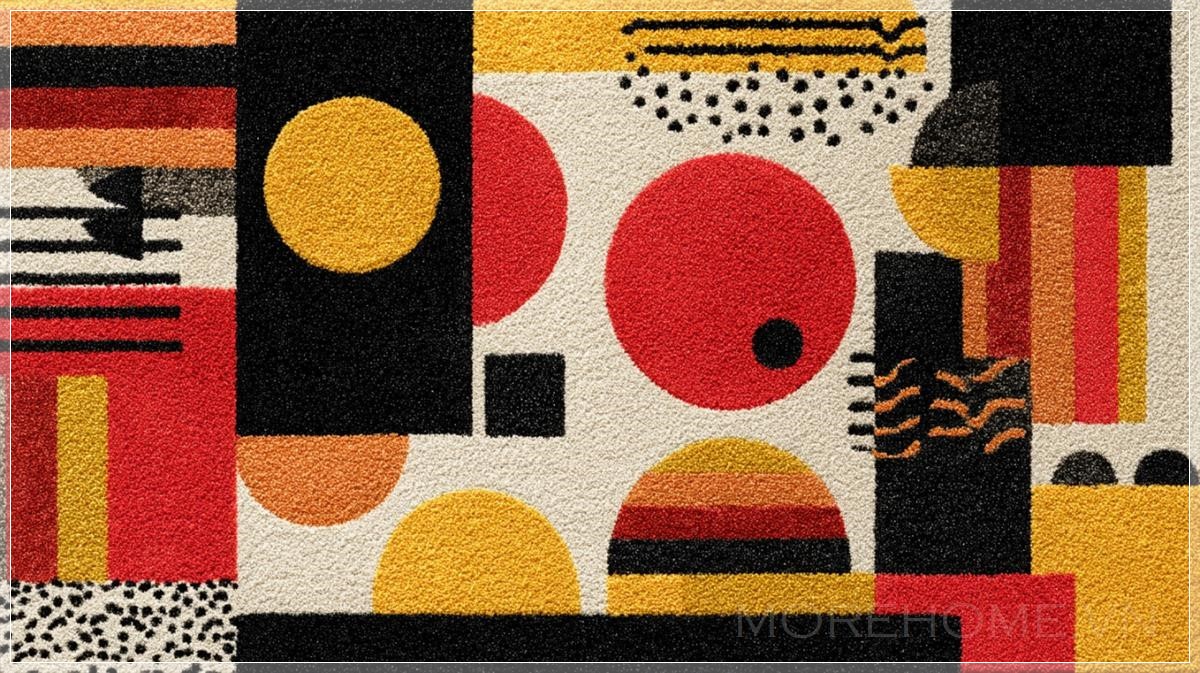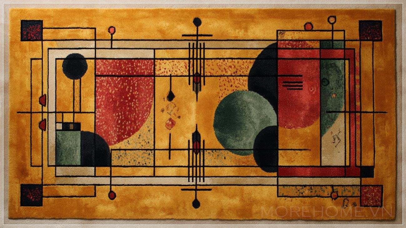 Thảm hình chữ nhật phong cách Memphis, với các họa tiết hình học nổi bật và màu sắc tươi sáng như đỏ, xanh dương, vàng và đen. Bề mặt thảm có các đường nét mạnh mẽ, kết hợp giữa các hình vuông, tam giác và đường chéo, tạo nên một không gian sống động và đầy năng lượng. Thảm được thiết kế với các khối màu sắc tương phản rõ rệt, làm nổi bật sự phá cách và tính độc đáo của phong cách Memphis. Những họa tiết này mang đến một vẻ đẹp hiện đại, trẻ trung và đầy tính nghệ thuật.