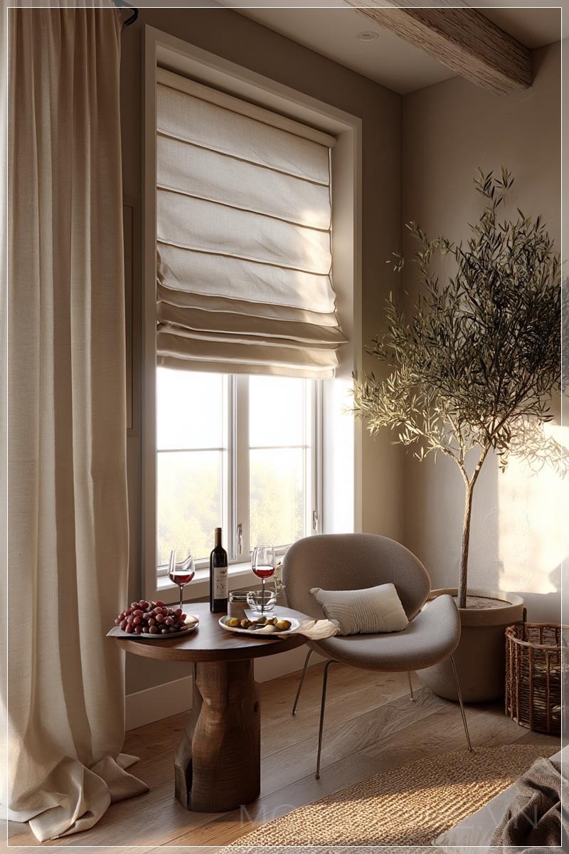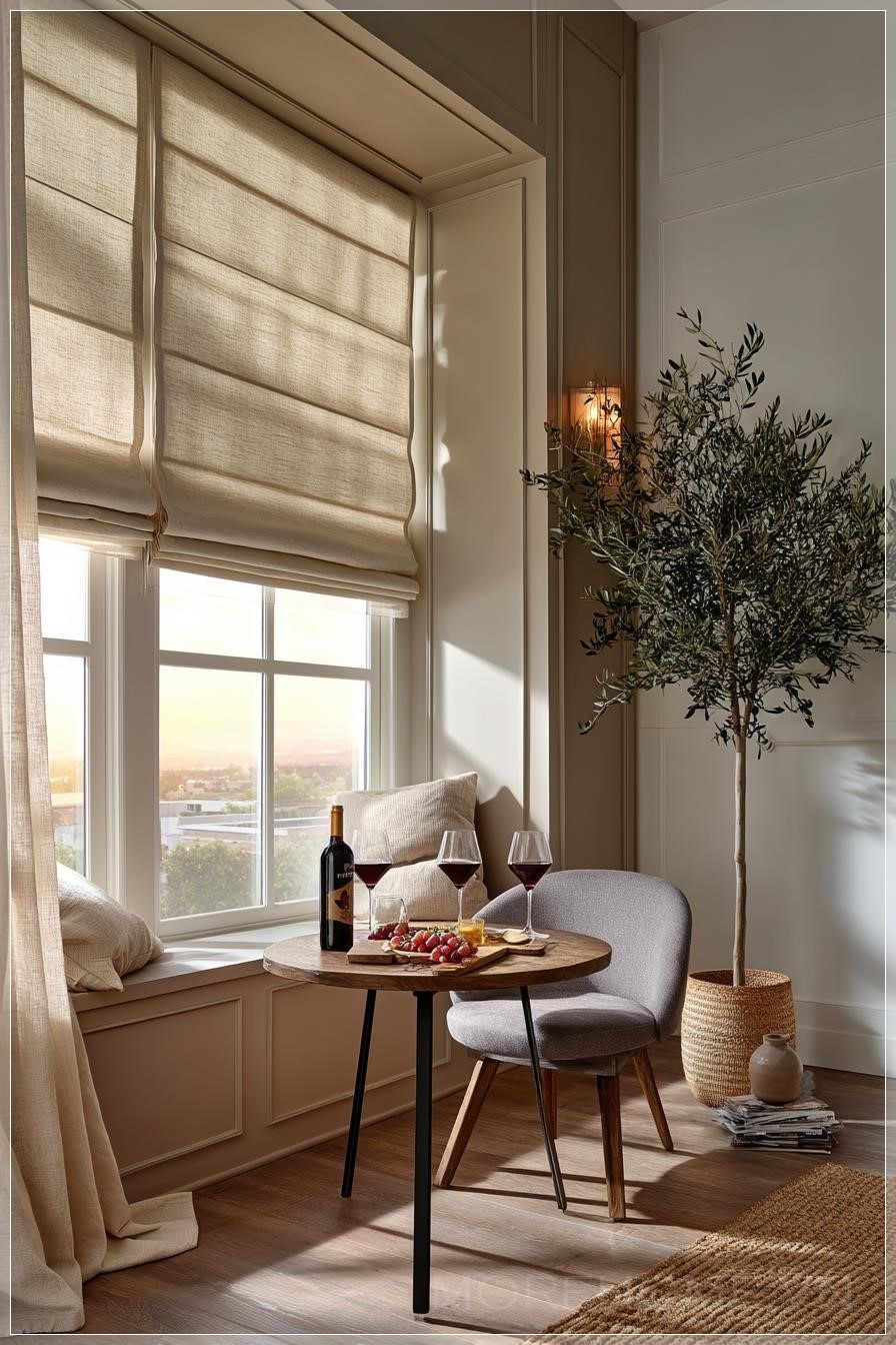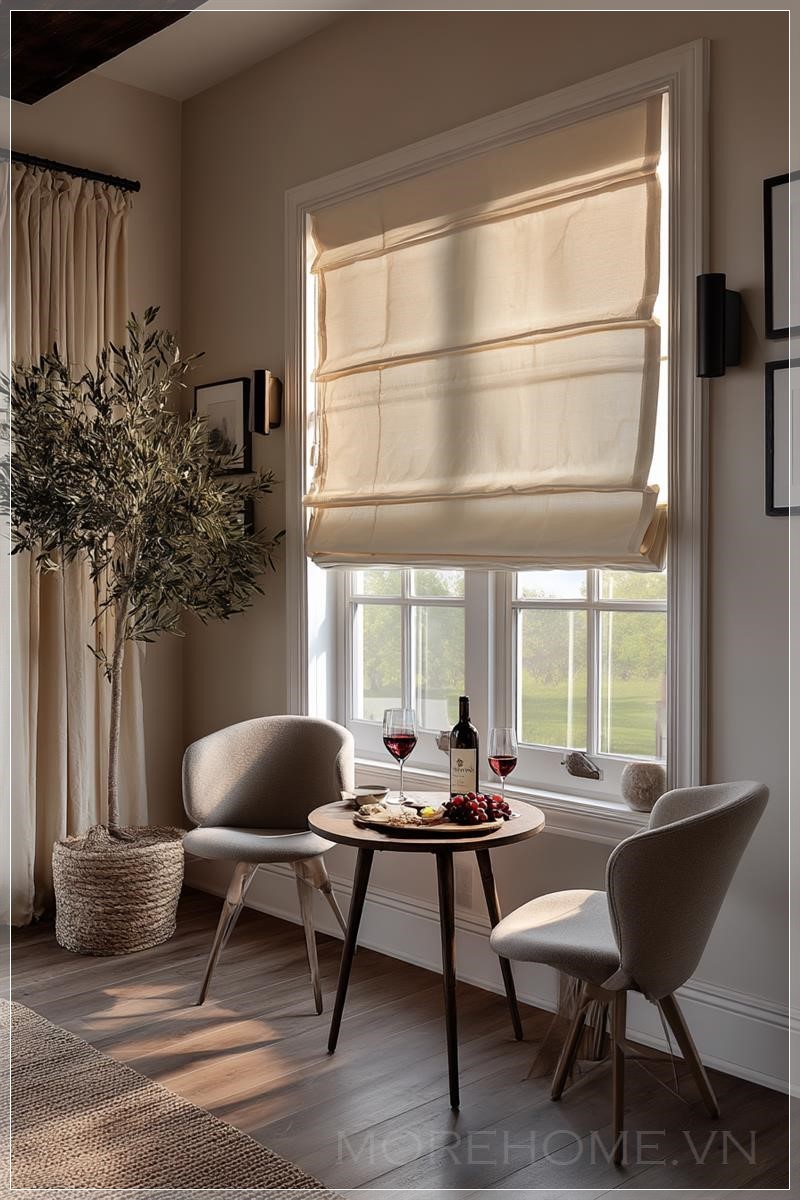 Góc nếm rượu ấm áp, thân mật, chụp từ góc rộng, nằm trong một ngôi nhà theo phong cách nhà nông hiện đại hoặc phong cách mộc mạc. Không gian này có một cửa sổ cao được trang trí với rèm Roman cổ điển, chất liệu vải lanh màu yến mạch hoặc ngà. Rèm được hạ một phần từ trên xuống và nâng một phần từ dưới lên, cho phép ánh sáng vàng giờ vàng nhẹ nhàng chiếu qua giữa, làm nổi bật thiết kế gấp gọn và kết cấu vải tinh tế. Bên cạnh cửa sổ là một chiếc bàn bistro nhỏ hình tròn với hai ly rượu sang trọng, một chai rượu vang đỏ mở, và một đĩa gốm mộc mạc chứa nho và pho mát. Hai chiếc ghế kiểu giữa thế kỷ hiện đại với các gam màu nhẹ nhàng hoàn thiện không gian. Những bức tường có tông màu trung tính ấm (ví dụ như đất sét, trắng mềm), và bóng đổ tự nhiên chiếu qua sàn gỗ và thảm dệt. Một chậu cây ô liu hoặc cây sung đặt ở góc, và một chiếc rèm vải lanh mềm được kéo sang một bên tạo thêm sự chân thực. Không gian được tạo kiểu như một bức ảnh phong cách Pinterest, với ánh sáng điện ảnh mềm mại, kiểu chụp của máy ảnh Canon 5D Mark IV DSLR, độ phân giải cao, chiều sâu trường ảnh nông và chi tiết vải chân thực. Không có người, không có hiệu ứng CGI.