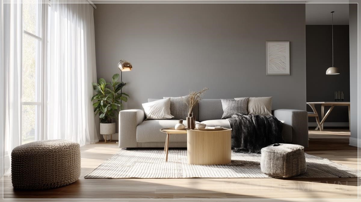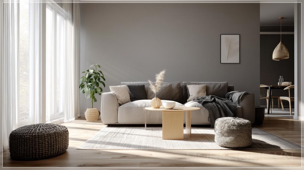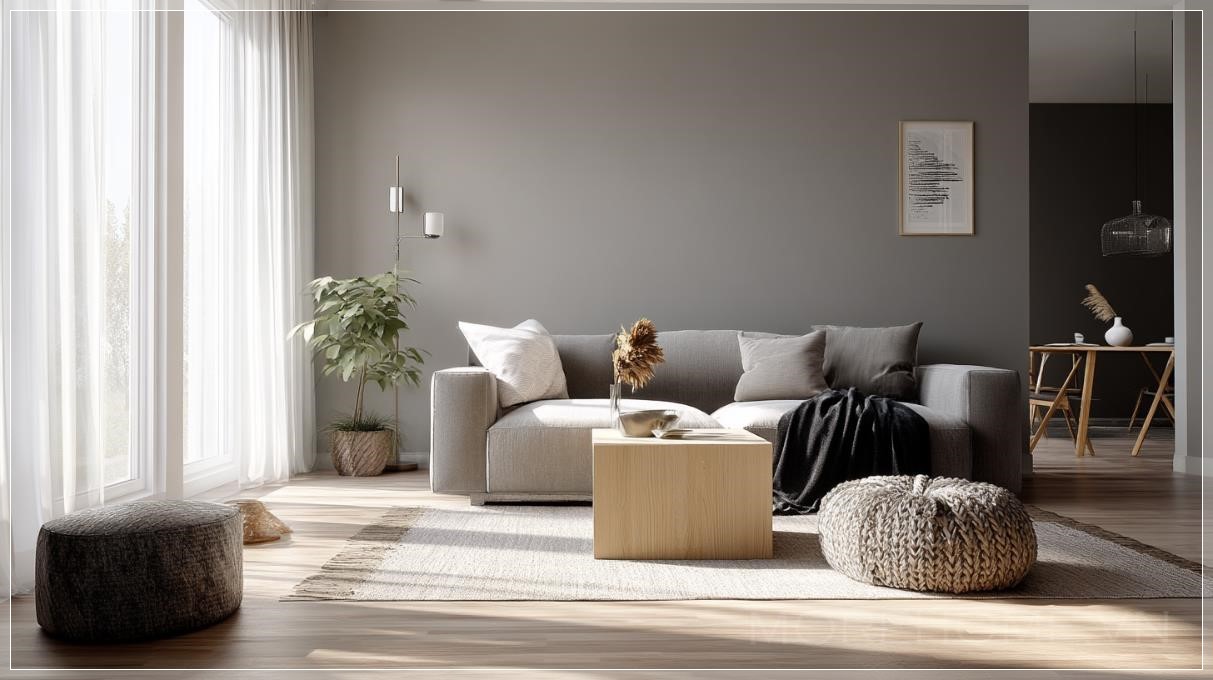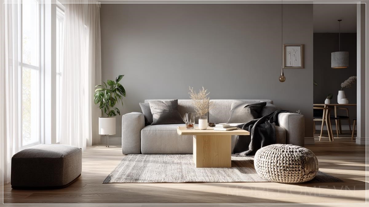 Một bức tường phòng khách, nhìn từ phía trước, môi trường xung quanh sáng sủa. Lấy cảm hứng từ phong cách Scandinavian. Ánh sáng mềm mại.