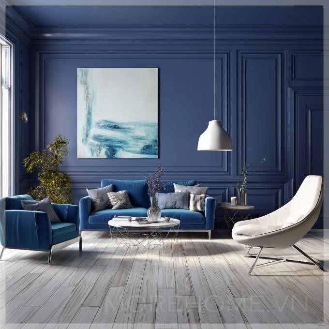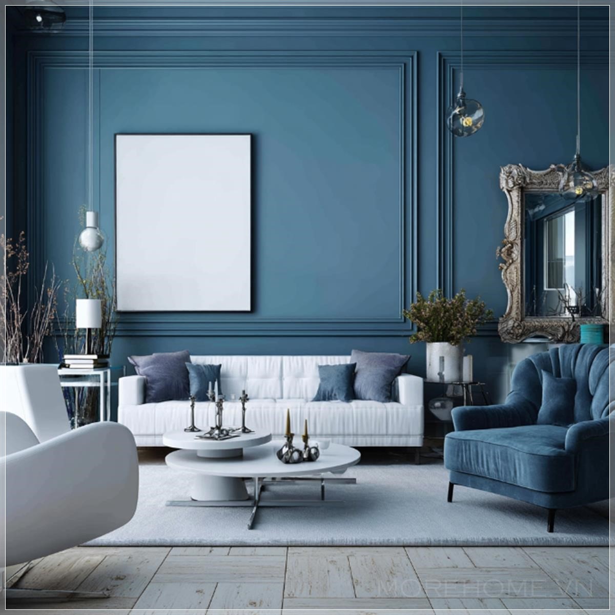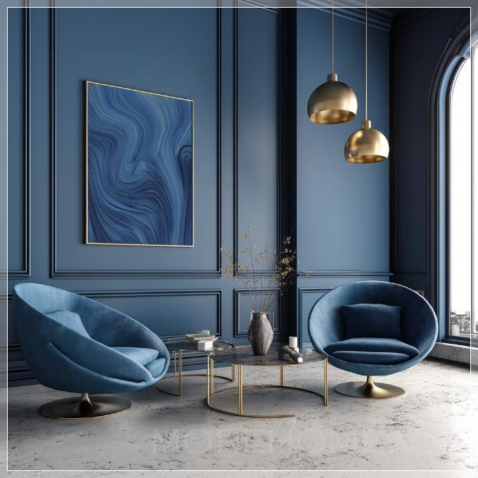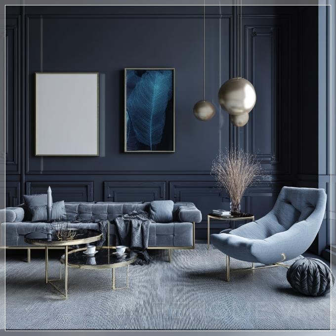 Phòng khách sang trọng với tông màu xanh, rất opulent, chứa các món đồ nội thất hiện đại tối giản, với điểm nhấn là một bức tường trống có không gian để treo một bức tranh.
