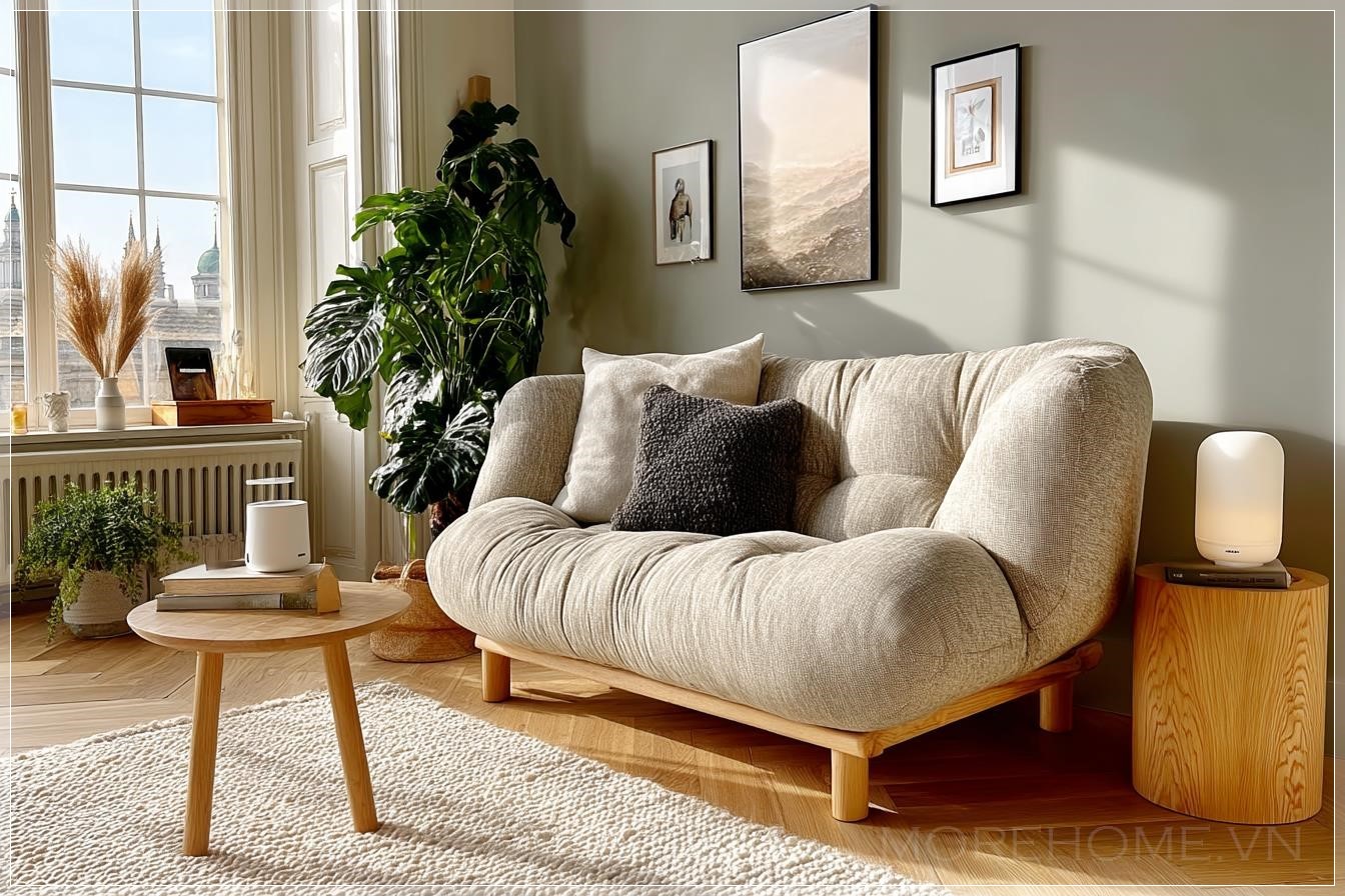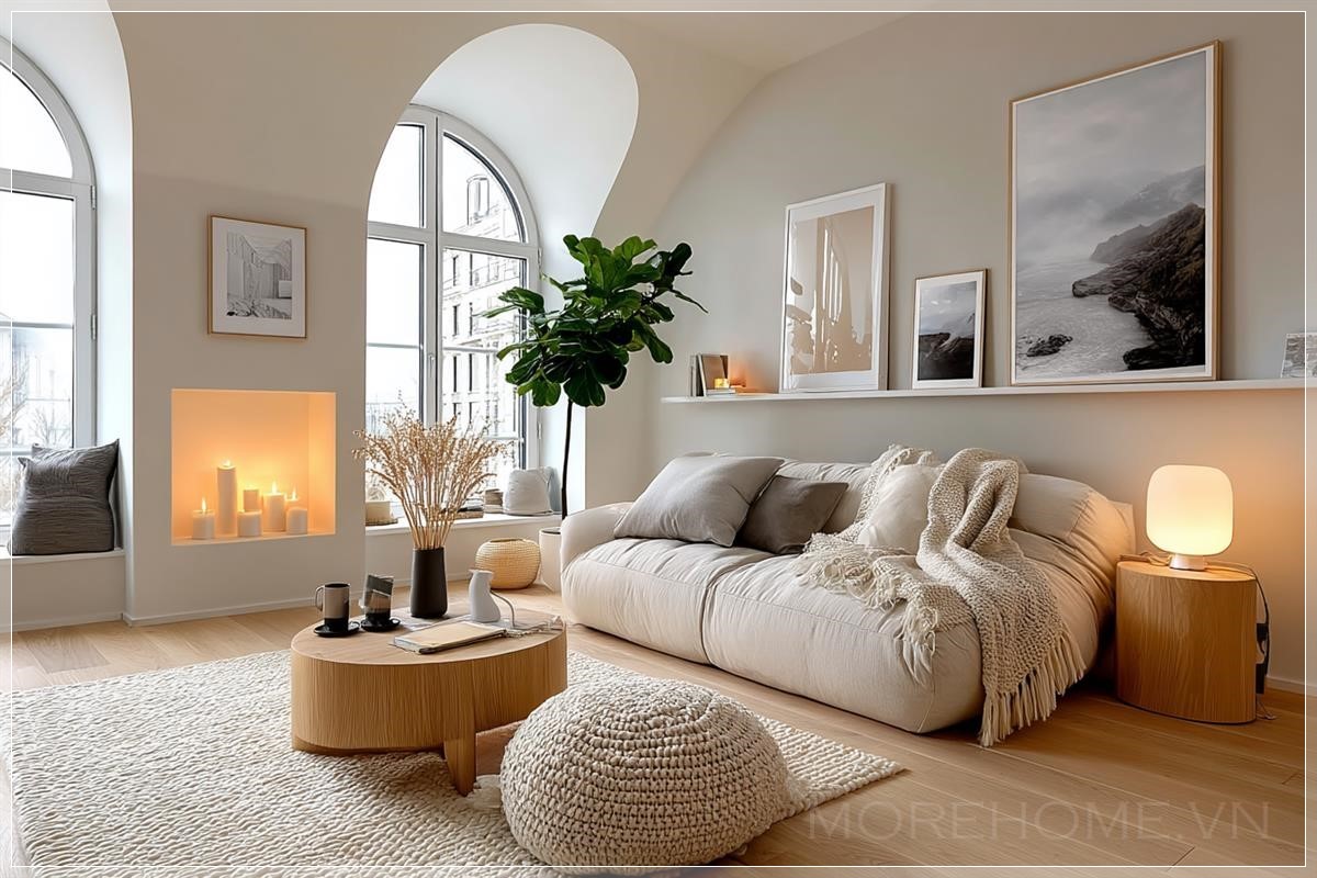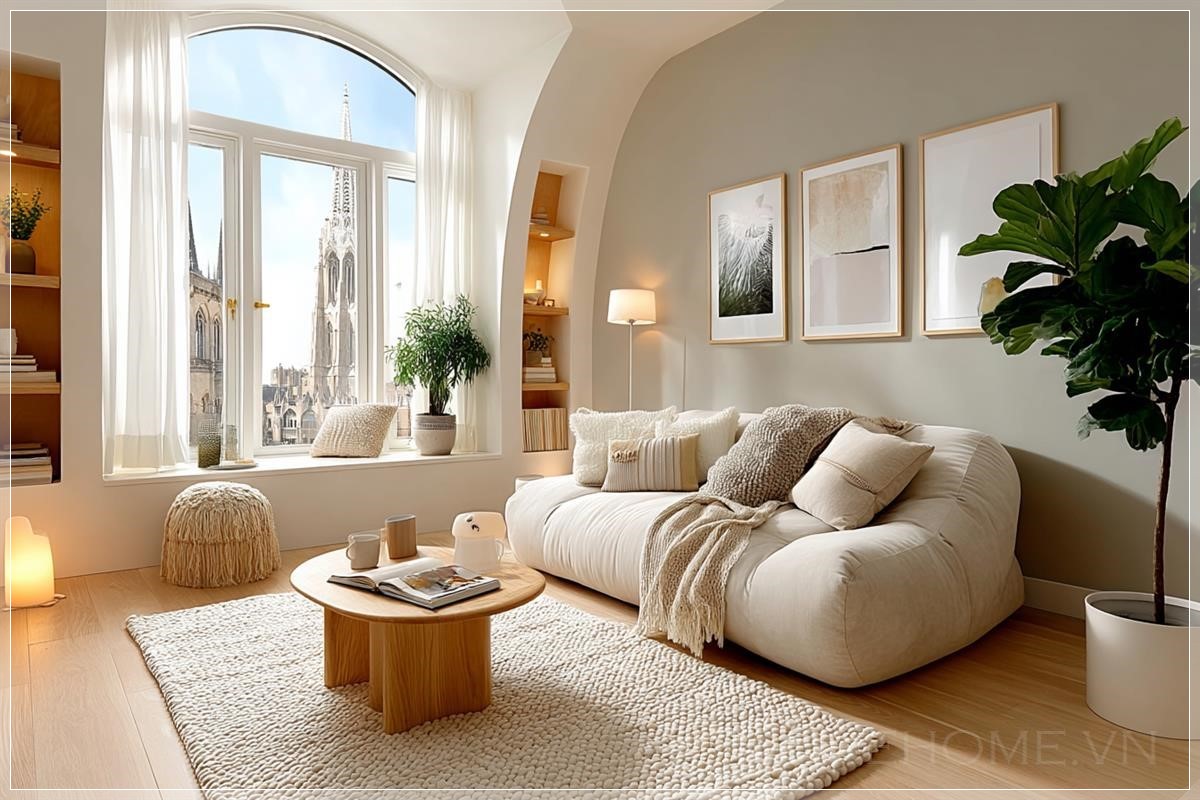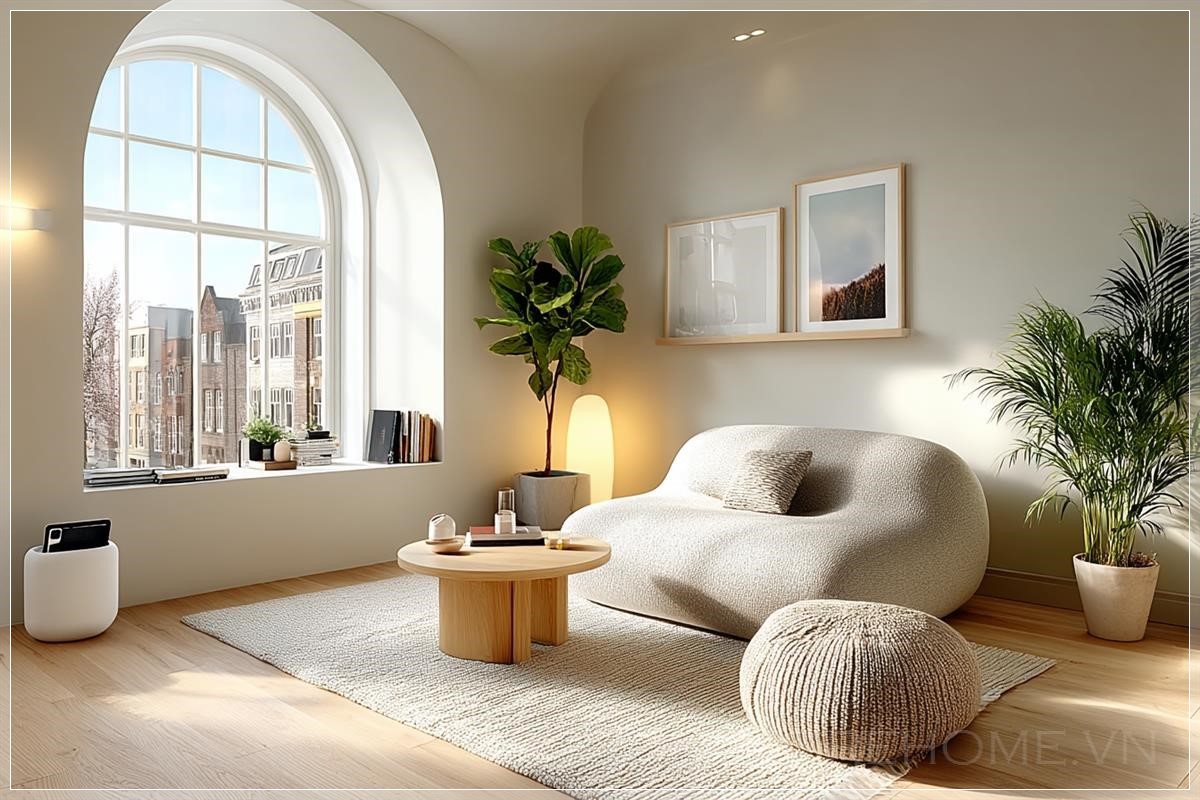 Phòng khách nhỏ nhưng ấm cúng theo phong cách tối giản lấy cảm hứng từ Apple, với một chiếc sofa vải màu be nhỏ gọn, có các đường viền mềm mại, đặt sát tường trắng mờ. Sàn nhà làm bằng gỗ sồi sáng màu, kết hợp với một bàn trà gỗ tròn nhỏ với các cạnh mềm mại. Không gian chủ yếu được chi phối bởi các tông màu tự nhiên: trắng, xám ấm, cát sáng và gỗ sồi. Một cửa sổ lớn duy nhất với rèm trắng mỏng cho phép ánh sáng tự nhiên chiếu vào, làm sáng phòng. Một cây cảnh cao, như cây dừa lá phô hoặc monstera, đứng ở góc phòng, mang lại hơi ấm tự nhiên. Phòng được trang trí tối giản với một hoặc hai bức tranh trừu tượng tông màu nhẹ, một chiếc đèn sàn trắng đơn giản với ánh sáng mềm mại, và một tấm thảm len có kết cấu màu trắng dưới bàn. Các chi tiết công nghệ kiểu Apple được tích hợp một cách tinh tế, như một chiếc MacBook đóng, một chiếc HomePod mini màu trắng, hoặc một chiếc iPad trên giá đỡ. Bầu không khí của căn phòng là sự yên bình, ấm cúng và sáng sủa, thiết kế để mang lại sự thoải mái và rõ ràng. Phong cách kết hợp giữa Scandinavian và Nhật Bản, với bố cục bình yên và cân bằng, mang lại cảm giác nội thất photorealistic.
