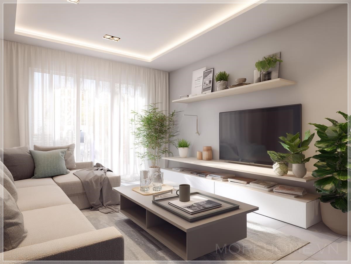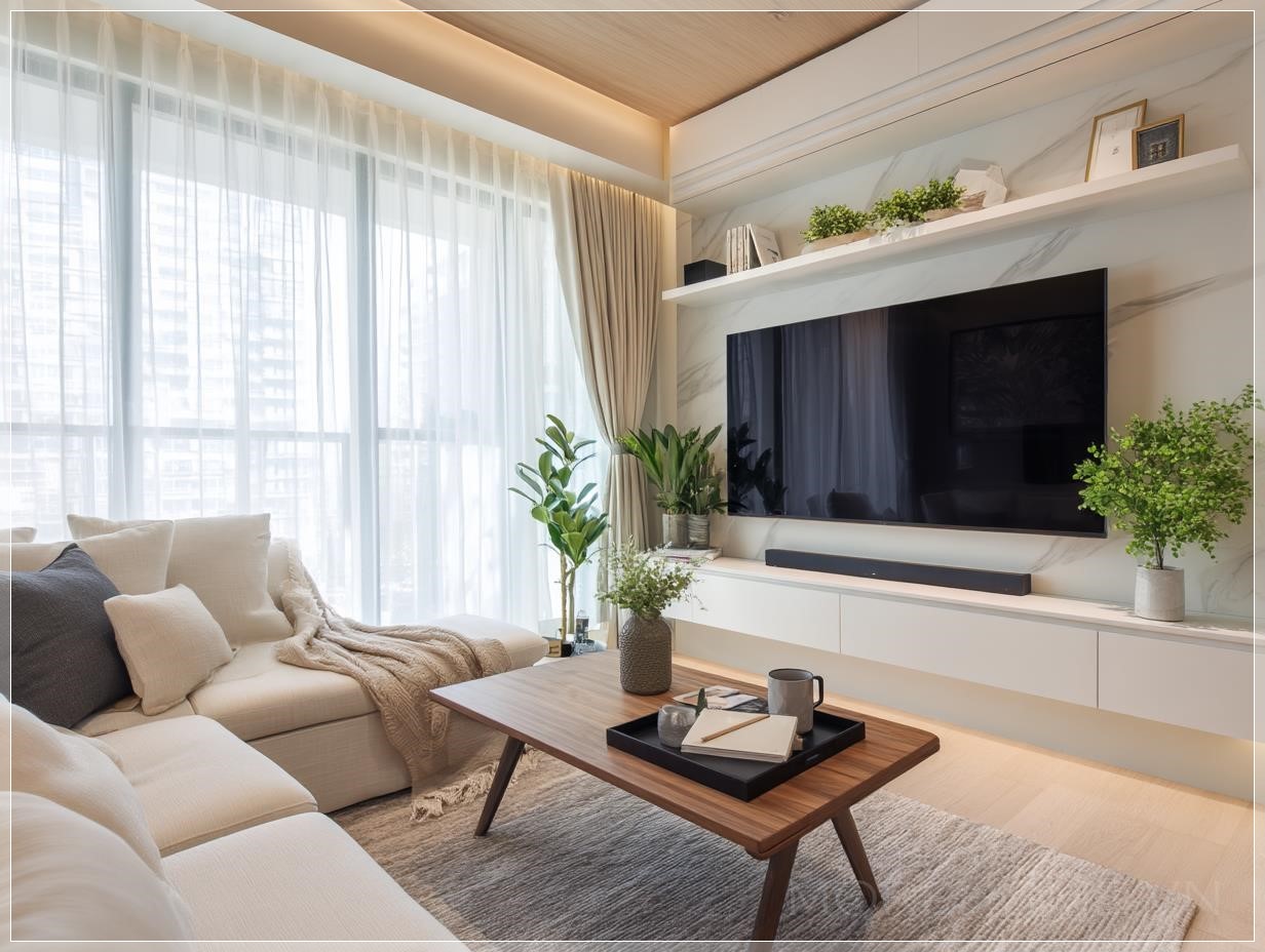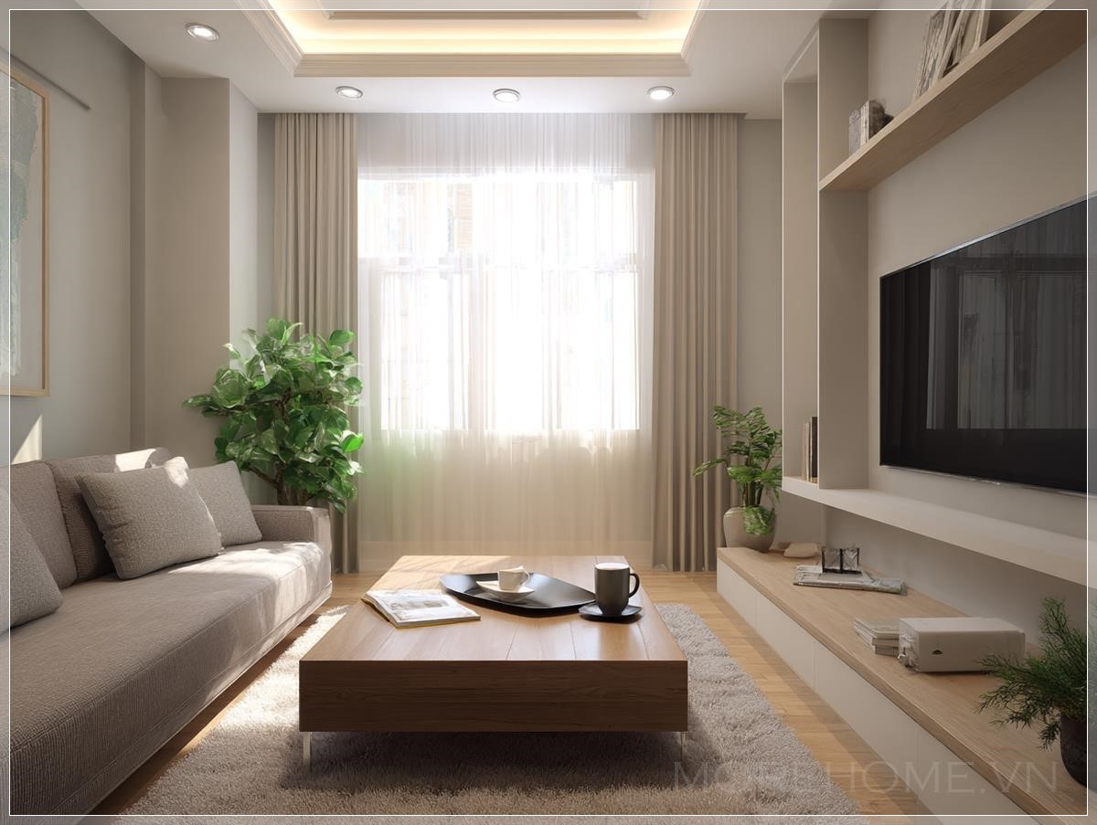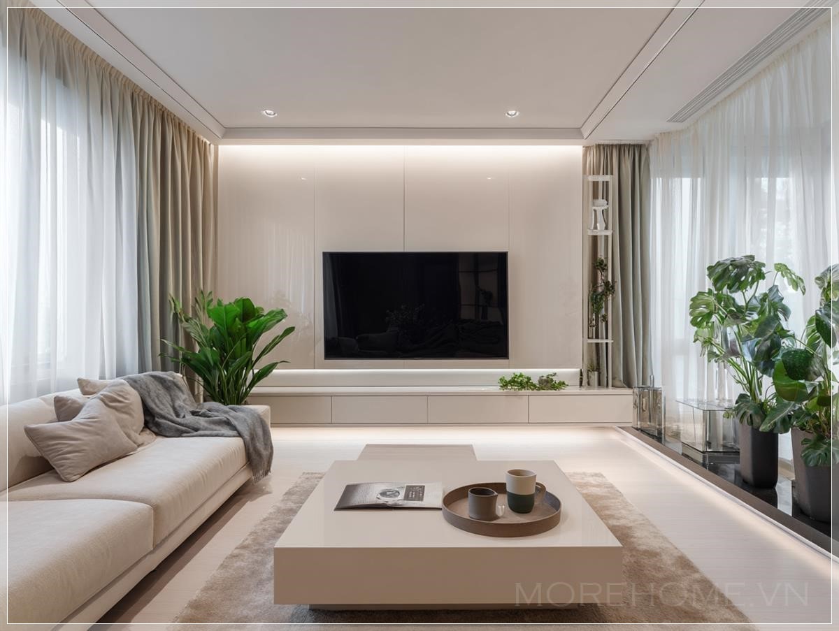 Phòng khách hiện đại được thiết kế với bảng màu trung tính, nổi bật với một chiếc TV màn hình phẳng lớn trên tường. Một chiếc bàn cà phê tinh tế với khay đựng một cốc và một cuốn sổ tay, trong khi một chiếc sofa thoải mái mời gọi sự thư giãn. Không gian được chiếu sáng tự nhiên qua rèm cửa mỏng và ánh sáng dịu nhẹ từ trần nhà cùng một kệ dưới TV. Những chậu cây cảnh làm không gian thêm phần sinh động với màu xanh tươi mát.