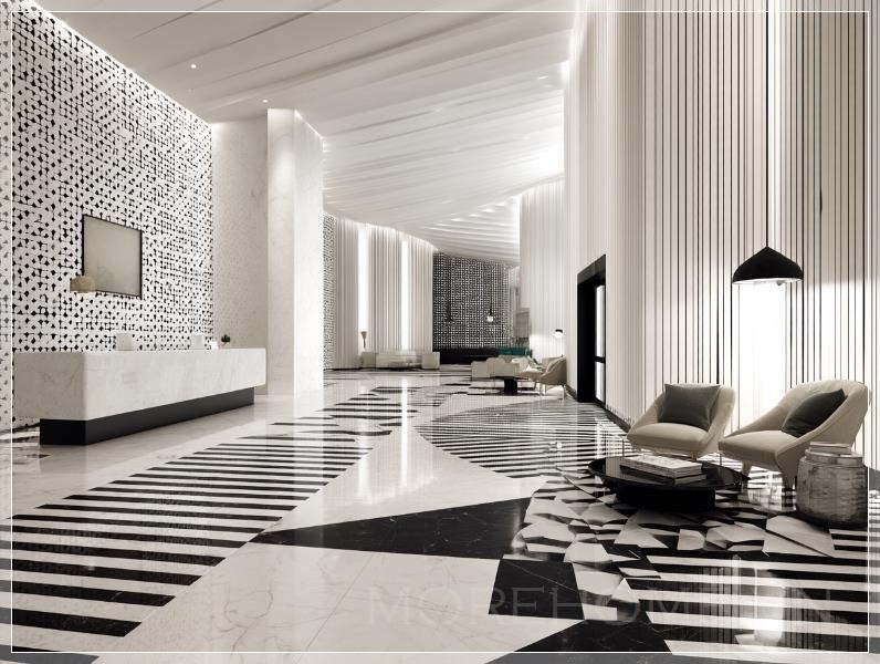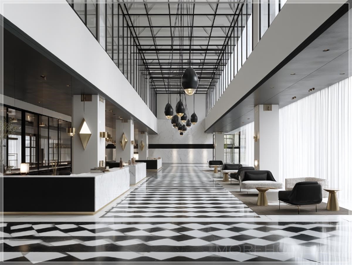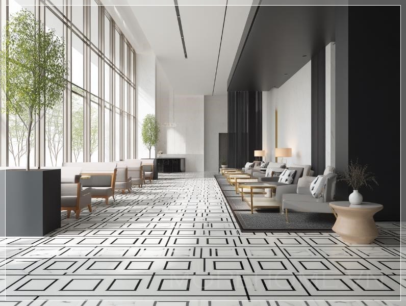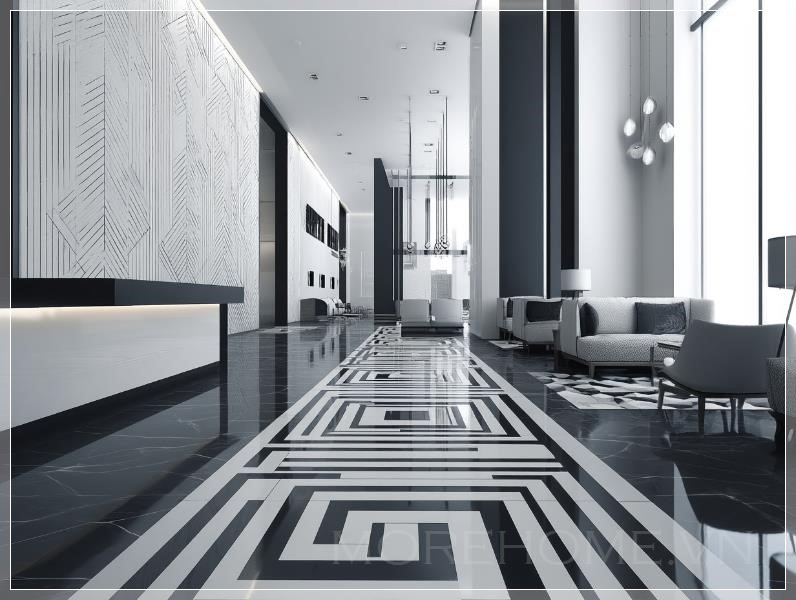 Thiết kế một họa tiết 2D hiện đại và sang trọng màu đen trắng, không có hình cong hay hình tròn. Thành phần nên bao gồm các đường thẳng sắc nét và các hình học như hình vuông, hình chữ nhật, và tam giác. Nhấn mạnh sự tối giản, độ chính xác và nhịp điệu trực quan thanh lịch phù hợp với lối vào sảnh khách sạn hình vuông. Duy trì bố cục sạch sẽ, mở rộng với phong cách tinh tế và sang trọng.