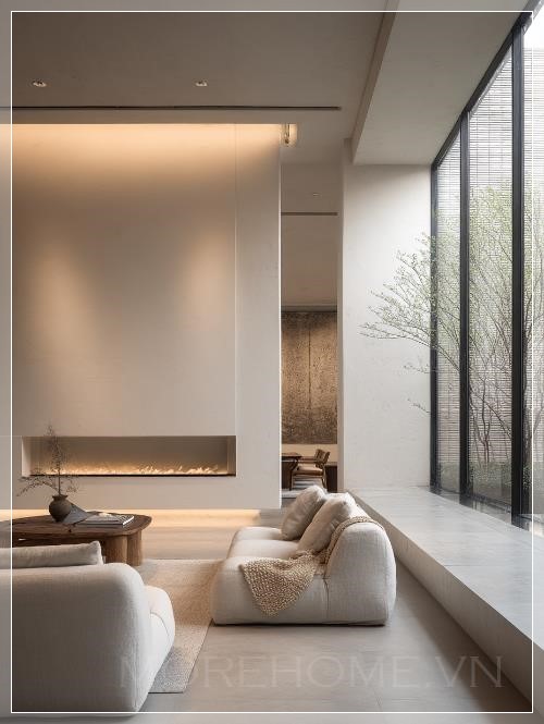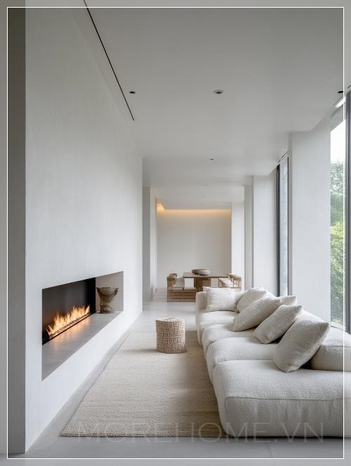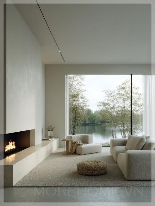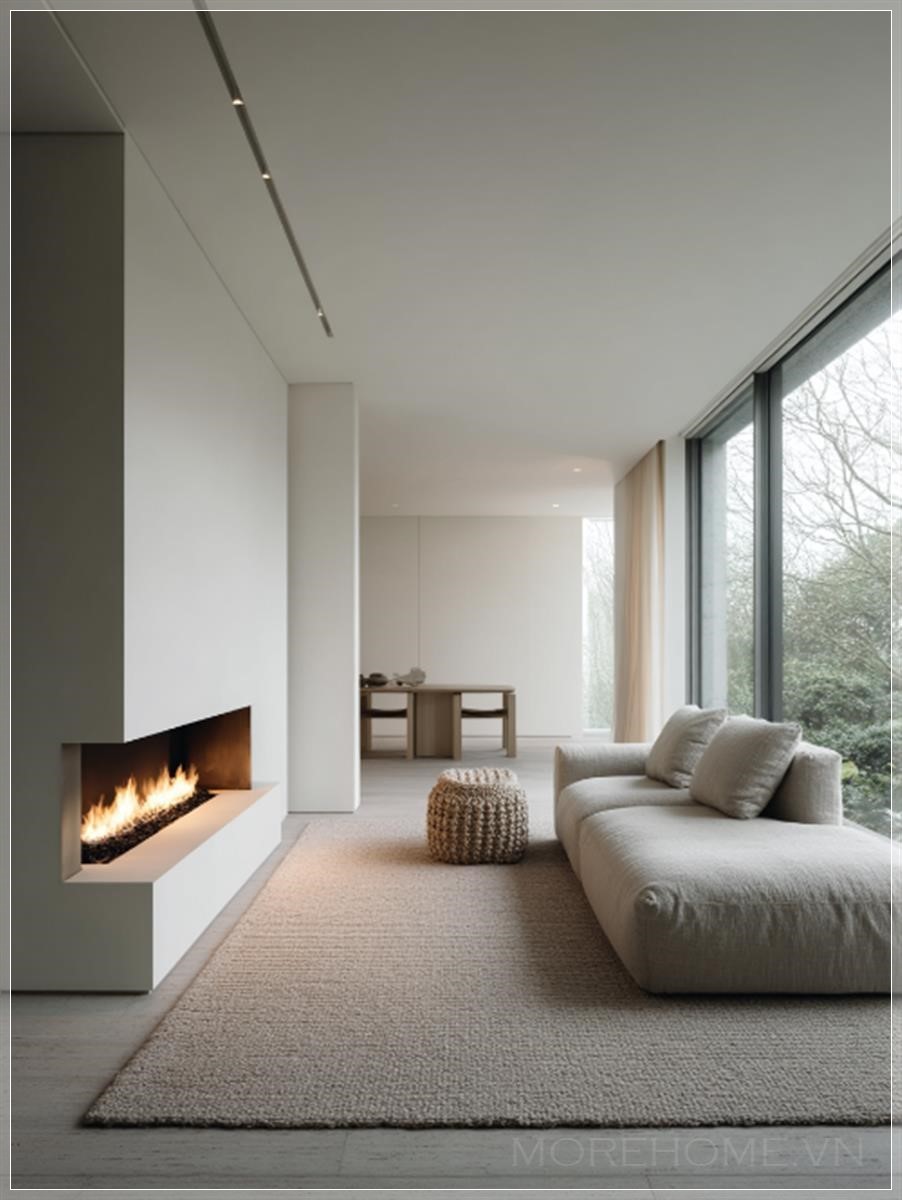 Phòng khách theo phong cách John Pawson, kết hợp với thẩm mỹ kiểu Songs và phong cách tối giản, không gian phẳng, chiều ngang. Từ cửa sổ kính suốt từ sàn đến trần, có thể nhìn thấy phòng ăn. Những cửa sổ kính lớn mang ánh sáng tự nhiên, với bộ sofa vải hai chỗ ngồi thấp, tựa lưng vào cửa sổ kính. Đối diện cửa sổ kính là lò sưởi atom hóa, được tích hợp vào tường TV trắng. Cánh cửa tủ lưu trữ trên một bức tường sạch sẽ, gọn gàng, không có tay cầm. Một chiếc ghế bên cửa sổ và bàn bên bằng mây tạo thành một góc yên tĩnh, nơi người mẹ đang đan áo len. Sàn đá mờ và tường nghệ thuật xi măng ấm áp kết nối liền mạch với nhau, trần phẳng giấu hệ thống đèn đường ray từ tính. Không gian trắng kiểu Song được tích hợp với hệ thống điều chỉnh ánh sáng thông minh hiện đại, hòa quyện giữa ánh sáng và bóng tối từ lò sưởi trong một bầu không khí ấm áp và sáng sủa. Render 4K thực sự tái hiện lại những nếp gấp của vải và kết cấu mờ của đá.