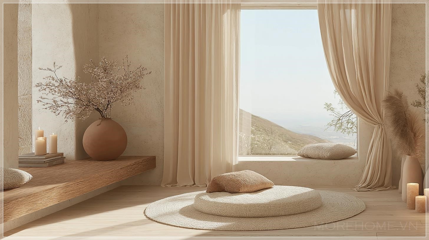 Ánh sáng buổi sáng nhẹ nhàng xuyên qua lớp rèm kem mỏng, chiếu lên những món đồ nội thất tối giản trong căn phòng thiền. Một chiếc gối ngồi tròn thấp màu trắng ngà nằm trên nền gỗ tự nhiên, xung quanh là những ngọn nến đặt trên sàn, tạo nên không gian ấm áp và dễ chịu. Bên cạnh đó, một chiếc bình gốm lớn chứa những cành cây đơn giản, được đặt trên một nền gỗ, tạo nên điểm nhấn tinh tế giữa không gian tĩnh lặng này.