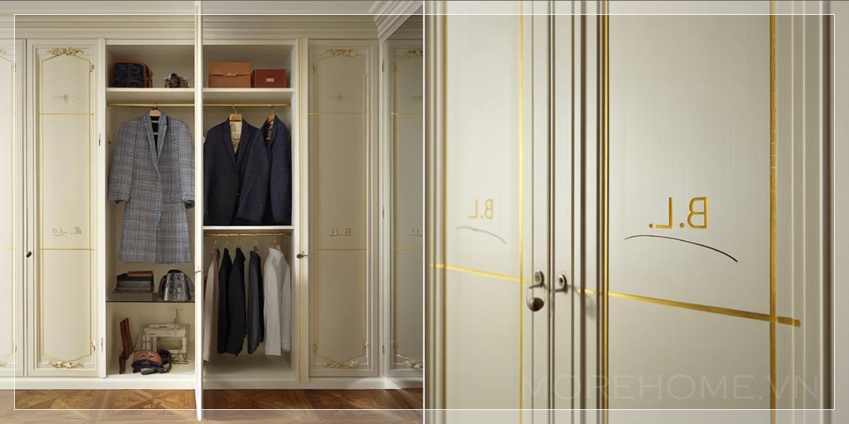 Liseré vàng mảnh này không chỉ là một chi tiết trang trí, mà còn thể hiện sự tỉ mỉ trong thiết kế, mang lại cho không gian một vẻ đẹp sang trọng nhưng không quá phô trương. Mỗi khi bạn mở cánh cửa của phòng thay đồ, ánh sáng phản chiếu từ những đường viền vàng càng làm tôn lên vẻ đẹp của nội thất, tạo nên một bầu không khí ấm áp và đầy lôi cuốn.
