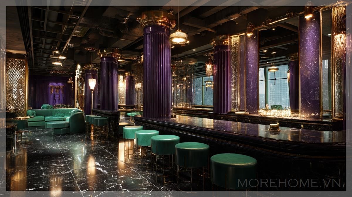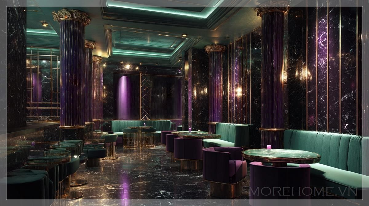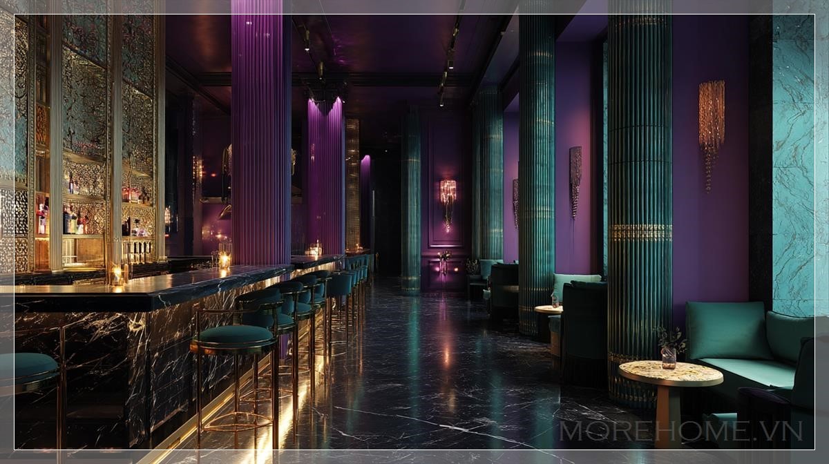 Không gian được thiết kế theo phong cách luxury tông màu purple ambient không chỉ là sự kết hợp của màu sắc và ánh sáng mà còn là sự chọn lựa tỉ mỉ trong từng món đồ nội thất. Các chi tiết như gương tròn, đèn chùm pha lê hay những bức tranh nghệ thuật mang màu sắc tương phản sẽ tạo ra một điểm nhấn nổi bật, giúp không gian trở nên sống động và đầy cảm hứng.