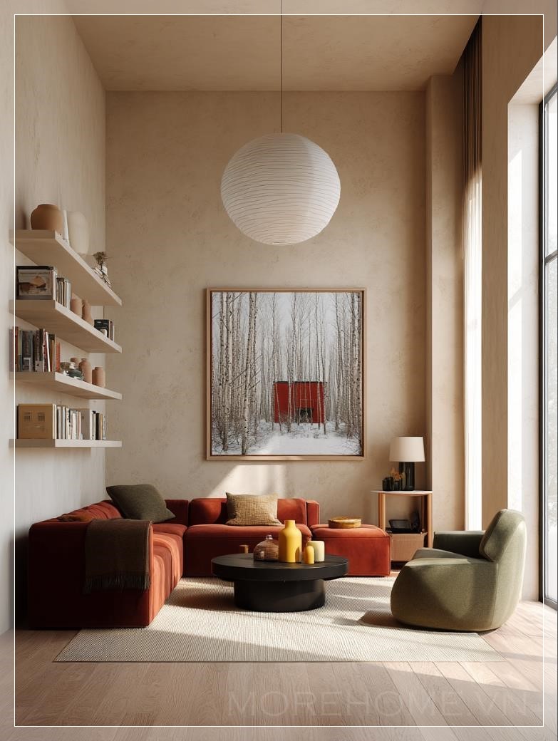 Màu sắc trong phòng khách này chủ yếu xoay quanh những tông màu nhẹ nhàng như trắng, đen, be, và các sắc thái của xanh lá và đỏ burgundy. Sự kết hợp này không chỉ mang đến cảm giác thanh thoát mà còn tạo nên không gian ấm cúng và mời gọi. Đặc biệt, ánh sáng tự nhiên được tối ưu hóa nhờ cửa sổ lớn, chiếu sáng nhẹ nhàng khắp phòng, làm tôn lên các chi tiết gỗ tự nhiên như sàn gỗ sồi nhạt và kệ nổi trắng tinh khôi. Các yếu tố như ánh sáng từ đèn lồng giấy trắng và các tác phẩm nghệ thuật trên kệ đều làm tăng thêm sự thanh lịch của không gian.