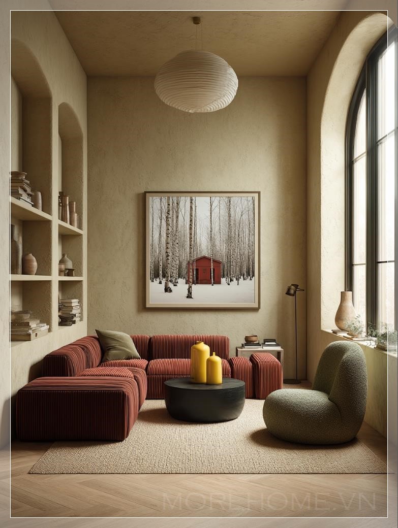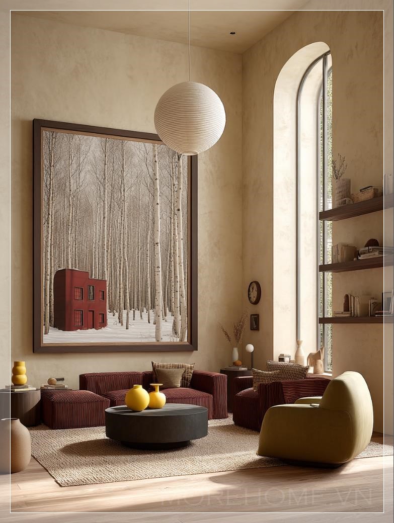 Điểm nổi bật của phòng khách này chính là sự kết hợp hoàn hảo giữa các yếu tố đơn giản nhưng tinh tế. Các bức tường được hoàn thiện bằng stucco màu be ấm, tạo ra một không gian nền ấm áp và thư giãn. Bức tranh nghệ thuật lớn, với hình ảnh cây bạch dương tuyết và một ngôi nhà container đỏ, trở thành điểm nhấn của không gian, mang lại sự tương phản tinh tế nhưng không kém phần ấn tượng. Các món đồ nội thất được chọn lọc kỹ lưỡng, từ chiếc ghế sofa burgundy vải nhung cho đến chiếc bàn cà phê tròn màu đen mờ, mỗi món đều có sự tinh tế riêng biệt nhưng vẫn rất hài hòa với tổng thể.