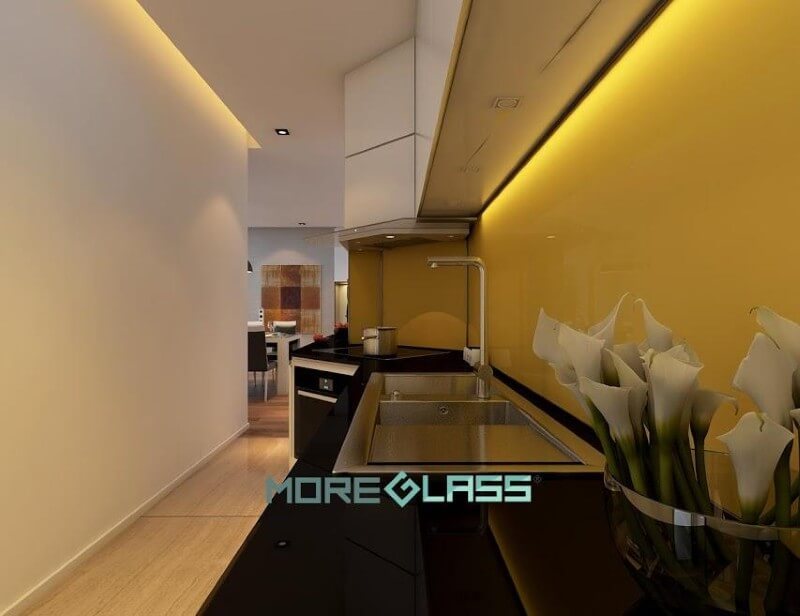 Thiết kế mẫu kính ốp bếp màu vàng thư tươi tắn cho không gian phòng bếp thêm mới lạ đầy sức sống.